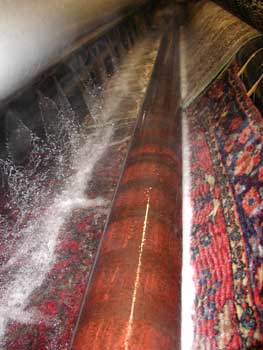 A fresh water rinse bath removes the loose soil and cleaning solution remaining in the rug. Proper rinsing is necessary to prevent re-soiling from residues left in the rug.
